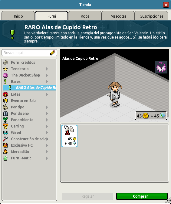 El romance vuelve a abrir sus alas en el hotel. Las Alas de Cupido Retro hacen su aparición como un RARO cargado de nostalgia y encanto clásico. Un ítem que evoca amor, elegancia y ese estilo atemporal que nunca pierde su magia. Ideal para quienes disfrutan de los detalles con historia.El RARO Alas de Cupido Retro, ya se encuentra disponible en el catálogo de Habbo por tiempo limitado. Podrás adquirirlo por un precio de 45 créditos + 45 diamantes. Por su compra recibirás una placa exclusiva en tu inventario. ¡A continuación te mostramos sus detalles y diseño!