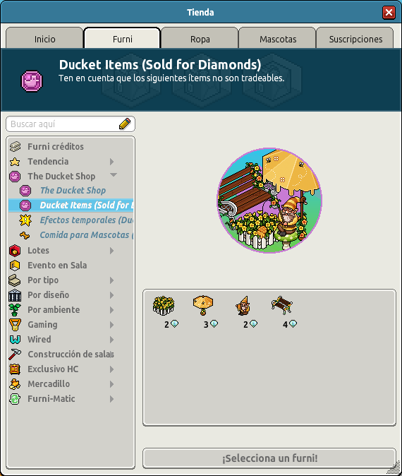 Hoy, el catálogo del hotel recibió la nueva categoría "Ducket Items (Sold for Diamonds)" dentro del apartado Furni » The Ducket Shop. Desde esta categoría, ahora se podrán conseguir los furnis de Primavera por Diamantes, en el caso de que no tengas Duckets para adquirirlos. Sus precios varían entre 2, 3 y 4 Diamantes.