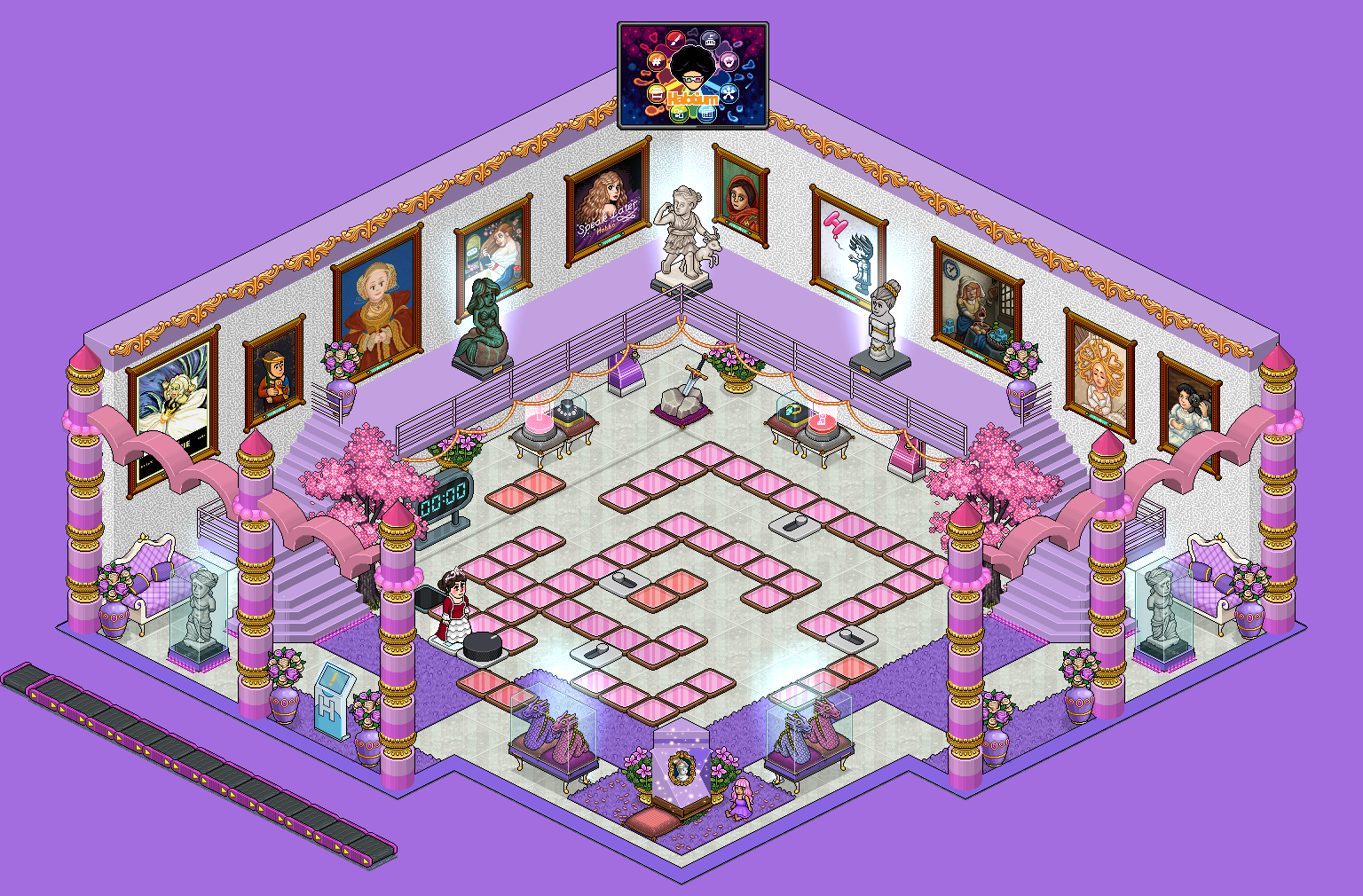 Al ingresar al hotel, si tienes un año o más registrado, recibirás automáticamente una notificación de agradecimiento con un anuncio de que has recibido artículos de regalo para que personalices tu Panel de Información. Estos artículos se tratan de una placa y tres furnis decorativos para tu Panel de Información (Infostand). ¡Te los mostramos a continuación!