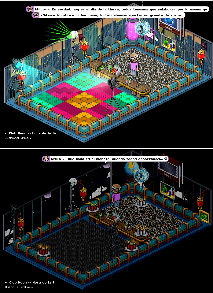 Pero en Habbo, que siempre queremos ir un poco más allá, incluso querríamos ver cómo algunas de las Salas adelantan esta medida... ¡Muéstranos cómo dejas en total oscuridad tu rincón preferido en Habbo a través de un pantallazo! El que podrás enviar a concursos@sulake.com, con el asunto '¡Luces fuera!'. Los autores de los mejores recibirán un Bono de un mes de suscripción al Habbo Club como recompensa.