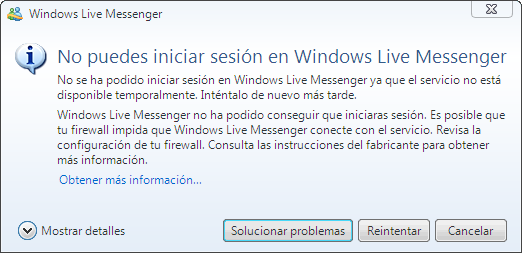 Presiona sobre "Mostrar detalles", seguramente te saldrá un código de error. Ese código lo pones en google junto con la palabra messenger o msn y te podría salir una página de Messenger Adictos.