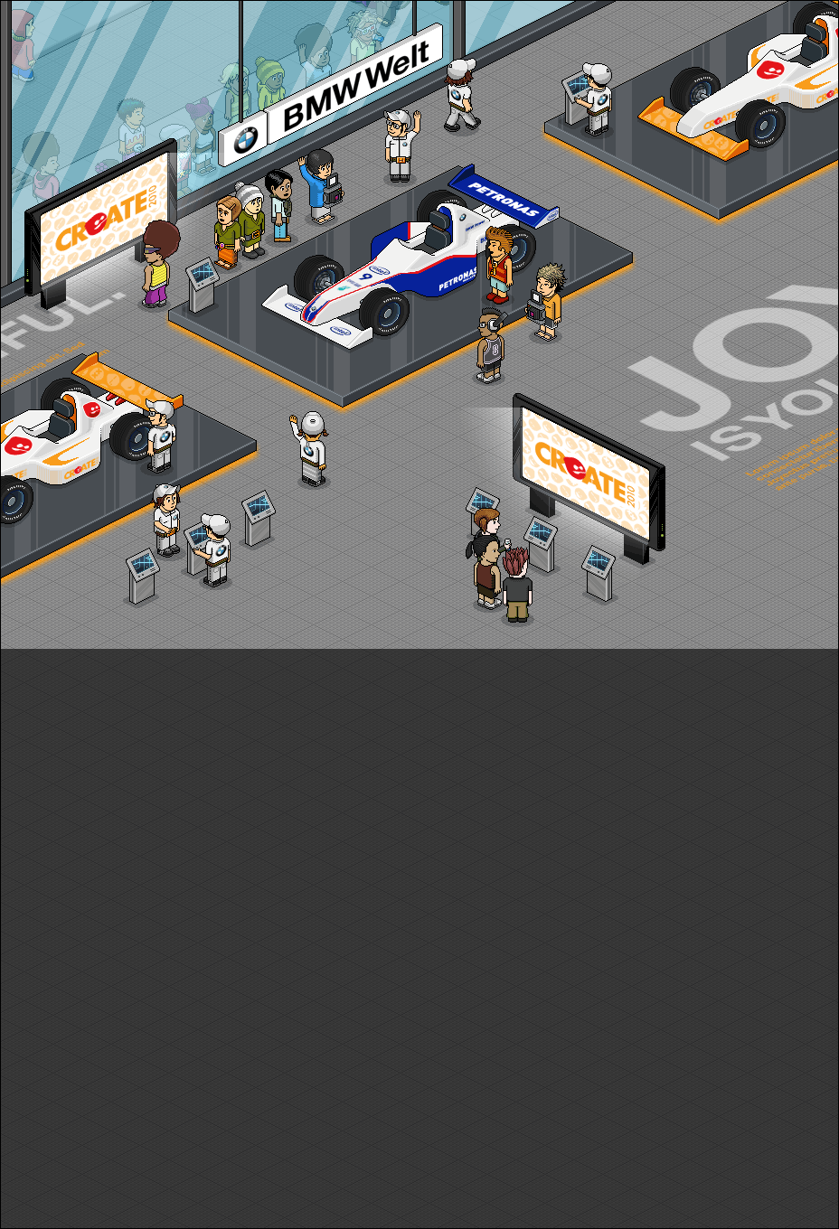 La primera, correspondiente fondo de grupo, en el cual podéis observar el logotipo de esta campaña y la de BMW, la famosa marca de vehículos. En esta especie de exposición observamos tres coches de Fórmula 1. A los extremos dos con la promoción y en el medio el de BMW Sauber, que se retira este año de la Fórmula uno. Te lo muestro a continuación.
