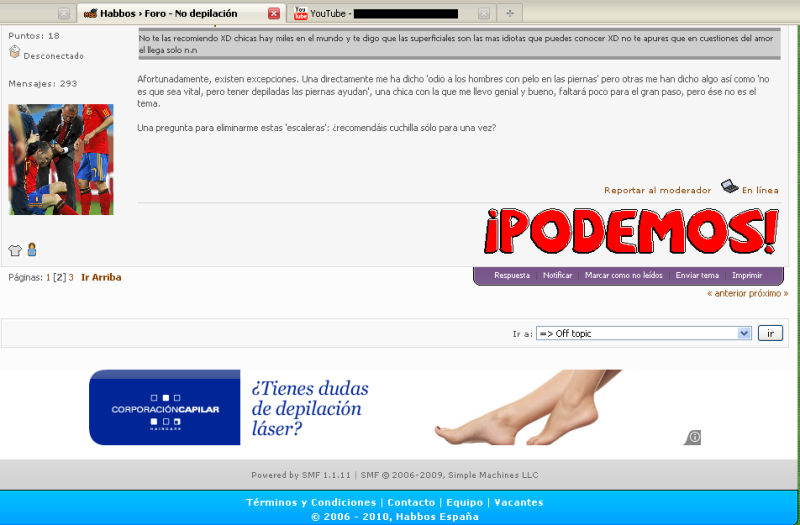 Hola a todos, el problema esque me están 'puteando' un poquillo con el tema de que yo no me depilo las piernas. Las chicas me dicen que si les causa mejor impresión estéticamente los no depilados, que si soy menos higiénico...
