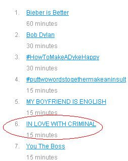 Una vez más, un tema relacionado con Britney Spears se hace acrededor de ser Trending Topic en una de las redes sociales más importantes del mundo. En este caso, tal 'In Love with a Criminal" se encuentra entre los temas más comentados de Twitter:
