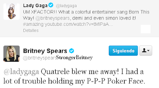 Lady gaga escribió un mensaje en su cuenta de twitter tras ver a uno de los curiosos participantes de X Factor, quien interpretó "Born This Way" y Britney le respondió lo siguiente.