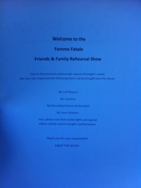 Esta noche se está realizando el último ensayo antes de comenzar oficialmente el día de mañana el Femme Fatale Tour de Britney Spears. Algunos fans afortunados han ganado un lugar para presenciar este último ensayo -que es más completo que el visto por algunas 'celebridades' el viernes pasado.