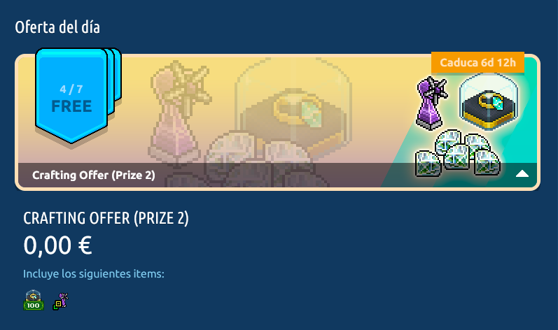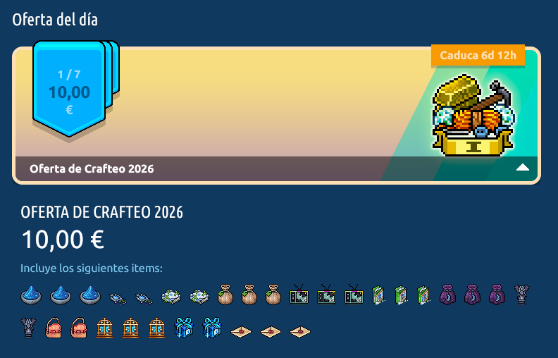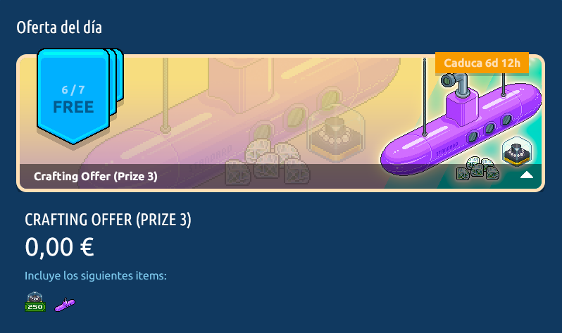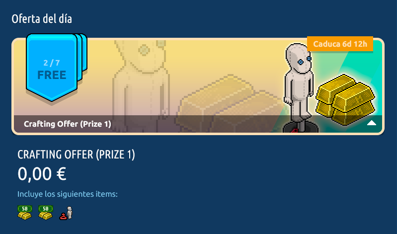 La Oferta de Crafteo se encuentra disponible desde la tienda de la página principal de Habbo (haz clic aquí para acceder directamente). Esta oferta es en cadena por lo que para solicitar una, deberás haber solicitado la anterior y así sucesivamente hasta la recompensa final. Sólo estará disponible por un tiempo limitado de 3 días. ¡A continuación podrás conocer la cadena de la Oferta de Crafteo, con su contenido y los precios según el país!
