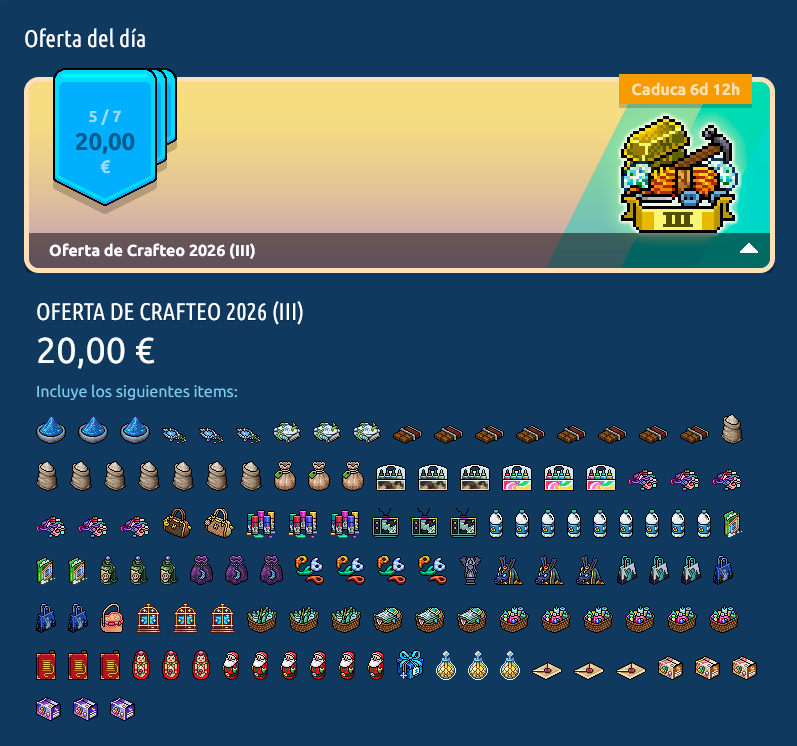 Oferta de Crafteo (III)Contiene una selección de ingredientes de crafteo y crackeables, y una placa exclusiva.
