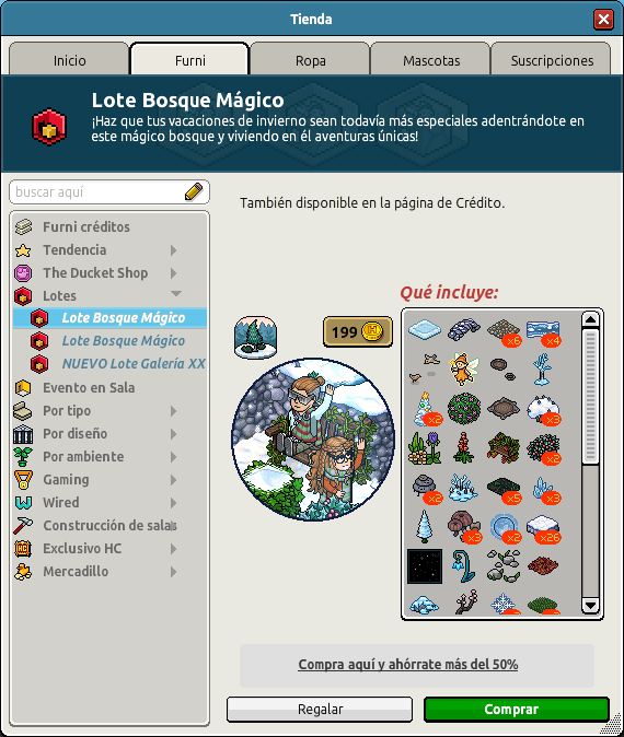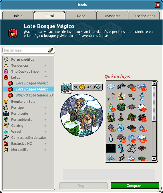 El Lote Bosque Mágico, cuarto lote de la campaña, ya se encuentra disponible en el catálogo de Habbo por un precio de 90 créditos + 90 diamantes o 199 créditos. Estará disponible por un tiempo limitado de aproximadamente una semana. Por su compra, recibirás una placa exclusiva que te mostramos a continuación junto con su contenido y sala.