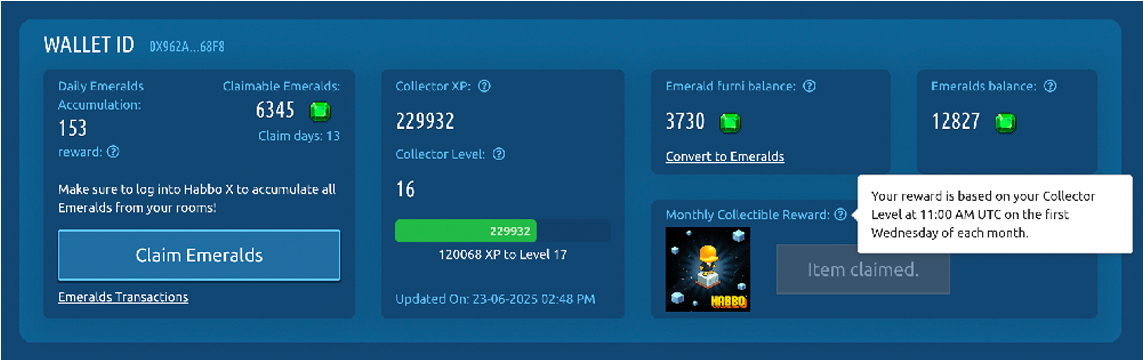 A partir de este miércoles 2 de julio, las recompensas de julio estarán disponibles para su reclamo en la pestaña Recompensas del Grupo de Coleccionistas en Habbo o en la tienda de Coleccionables en la página web, según tu nivel. Puedes saber cuál es tu Nivel de Coleccionista en la ventana del Grupo de los Coleccionistas o en la página de Coleccionables. A continuación te dejamos la vista previa de dónde se podrán reclamar.