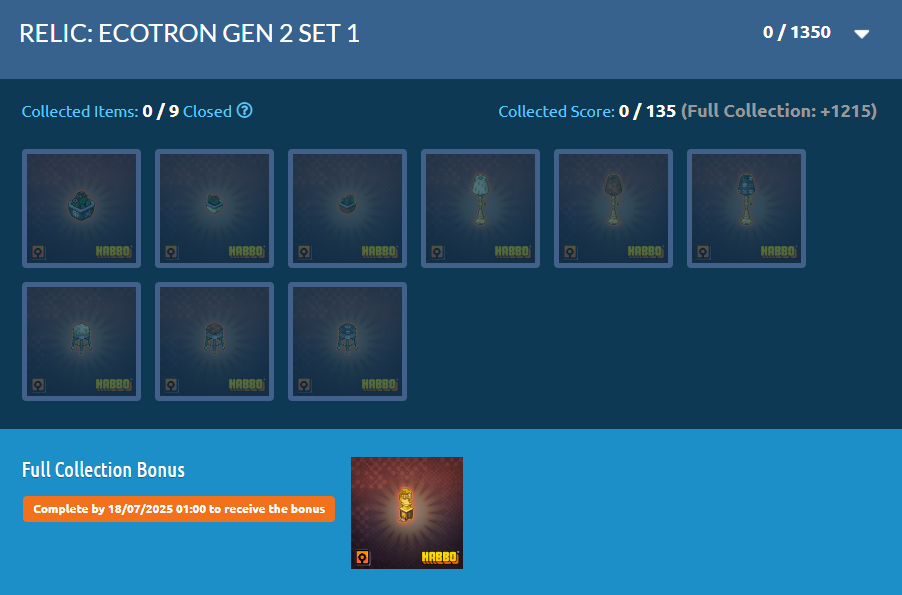 Reliquias: Ecotron Gen 2 - Set 1" está conformado por 9 Reliquias correspondientes a los furnis "Ecotron", el Set "