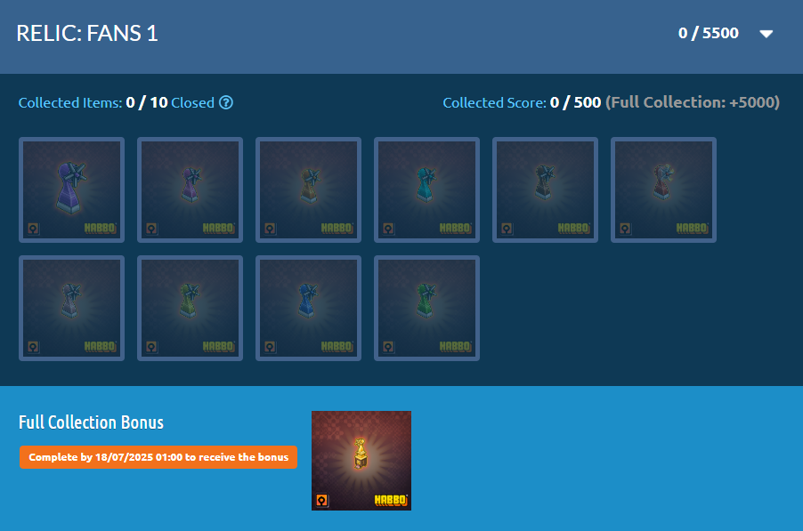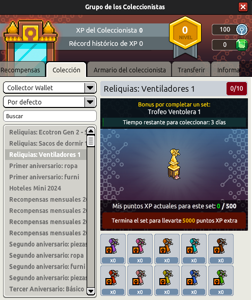 Reliquias: Ventiladores 1" está conformado por 10 Reliquias correspondientes a los raros "Ventoleras". Si conseguiste completar alguno de ellos dentro de la fecha establecida, es decir antes de hoy