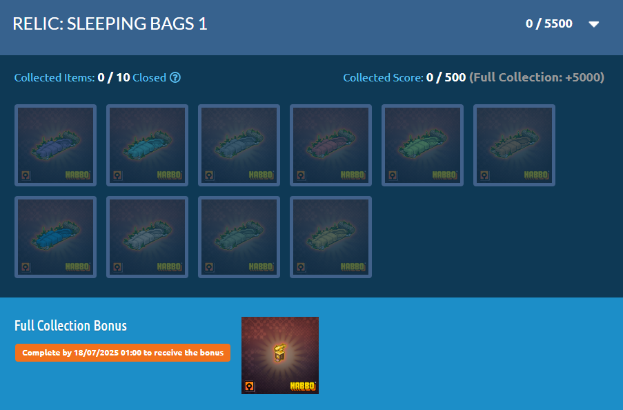 Reliquias: Sacos de dormir 1" está conformado por 10 Reliquias correspondientes al raro "Saco de dormir", y por último, el Set "