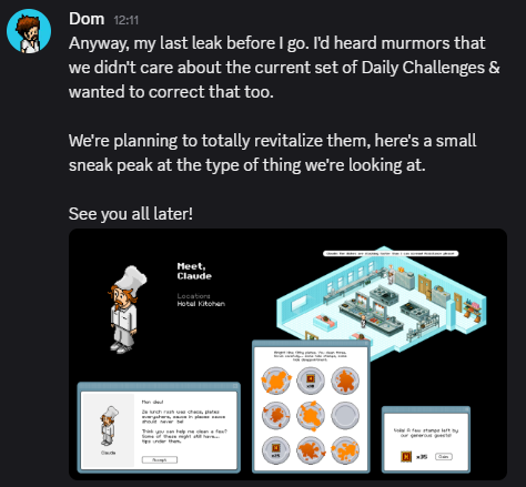 Había oído rumores de que no nos importaba el conjunto actual de Desafíos Diarios y queríamos corregirlo también. Estamos planeando revitalizarlos por completo. Aquí tenéis un pequeño adelanto de lo que estamos considerando.".