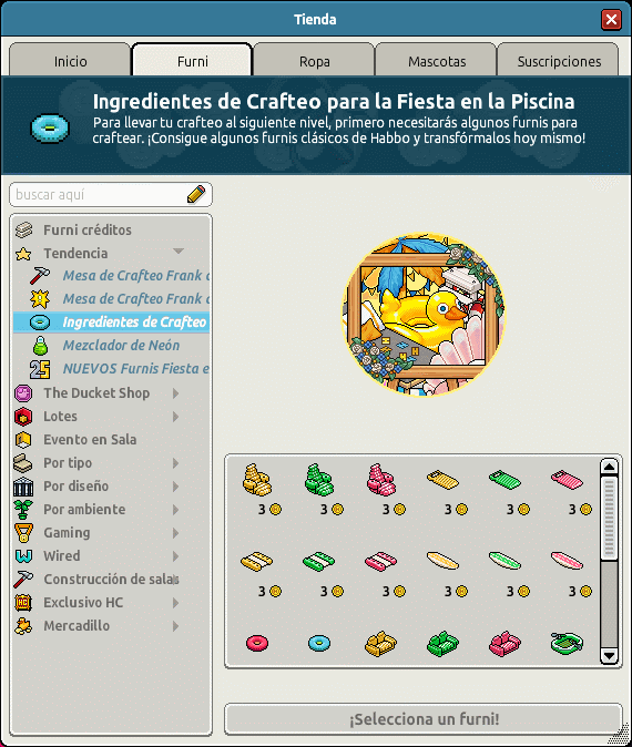 Furni » Tendencia » Ingredientes de Crafteo para la Fiesta en la Piscina. En este apartado, podrás encontrar los furnis antiguos de