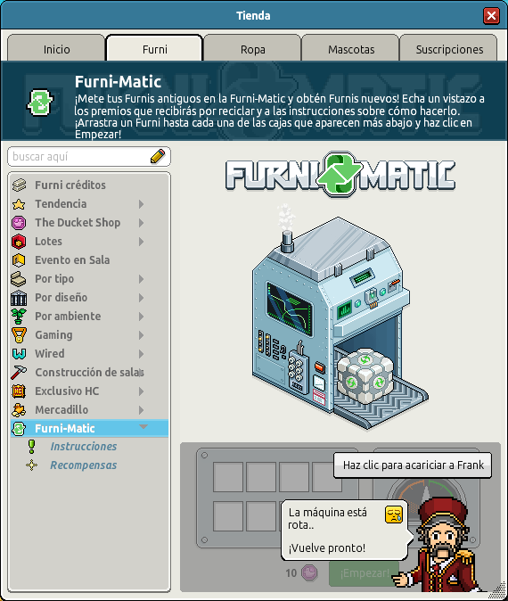 Nota: La Furni-Matic se deshabilitó desde el 7 de agosto a las 16:46 HPE hasta el 12 de agosto a las 14:00 HPE aproximadamente. Puedes encontrar las actualizaciones sobre esto en el hilo de la publicación de @habtium en X/Twitter. Durante el periodo inactivo, Habbo añadió la imagen de Frank con un cartel anunciando que está rota y un botón para acariciar a Frank como puedes ver en las imágenes a continuación.
