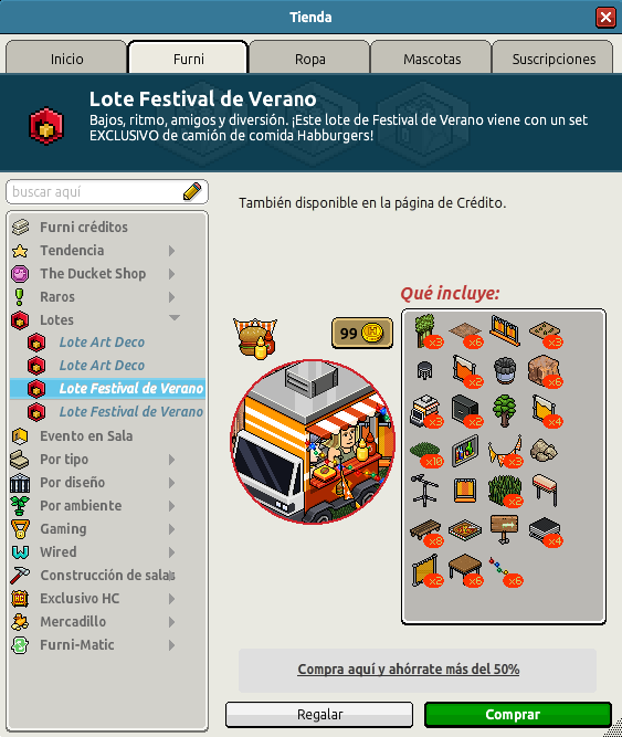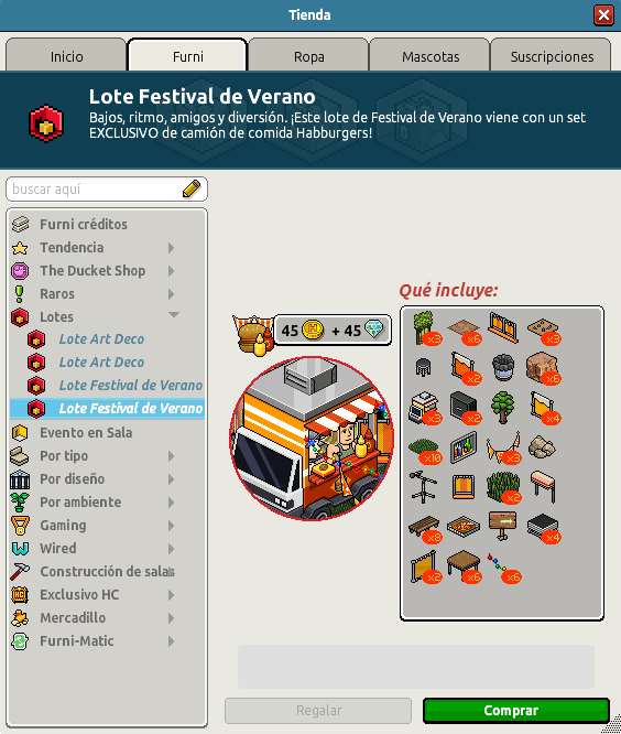 El Lote Festival de Verano, quinto lote de la campaña, ya se encuentra disponible en el catálogo de Habbo por un precio de 45 créditos + 45 diamantes o 99 créditos. Estará disponible por un tiempo limitado de aproximadamente una semana. Por su compra, recibirás una placa exclusiva que te mostramos a continuación junto con su contenido y sala.