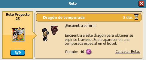 Encuentra a este dragón para obtener su espíritu travieso. Suele aparecer en una temporada especial en el hotel. Haz doble clic en el furni "