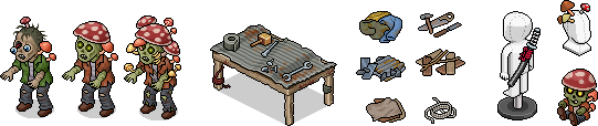 De izquierda a derecha: las tres formas de los Infectados, la mesa de crafteo y los ingredientes, además de la ropa y peluche de su contenido.