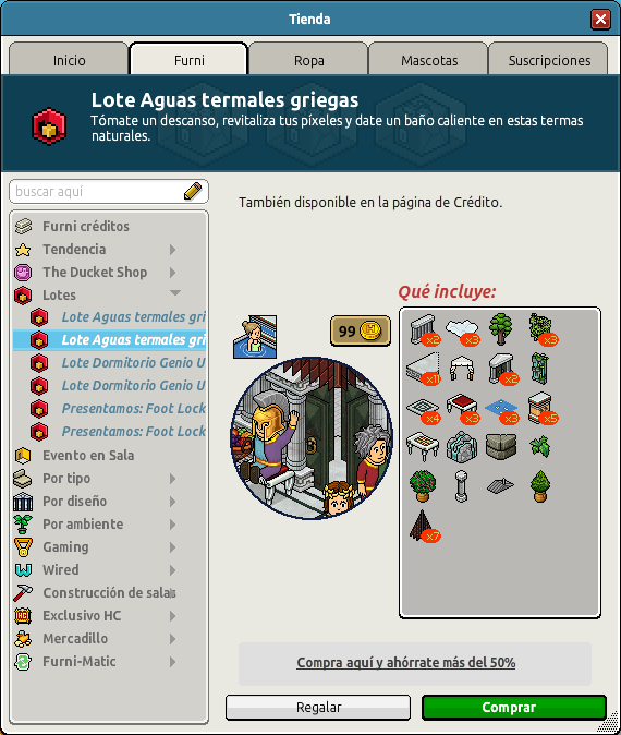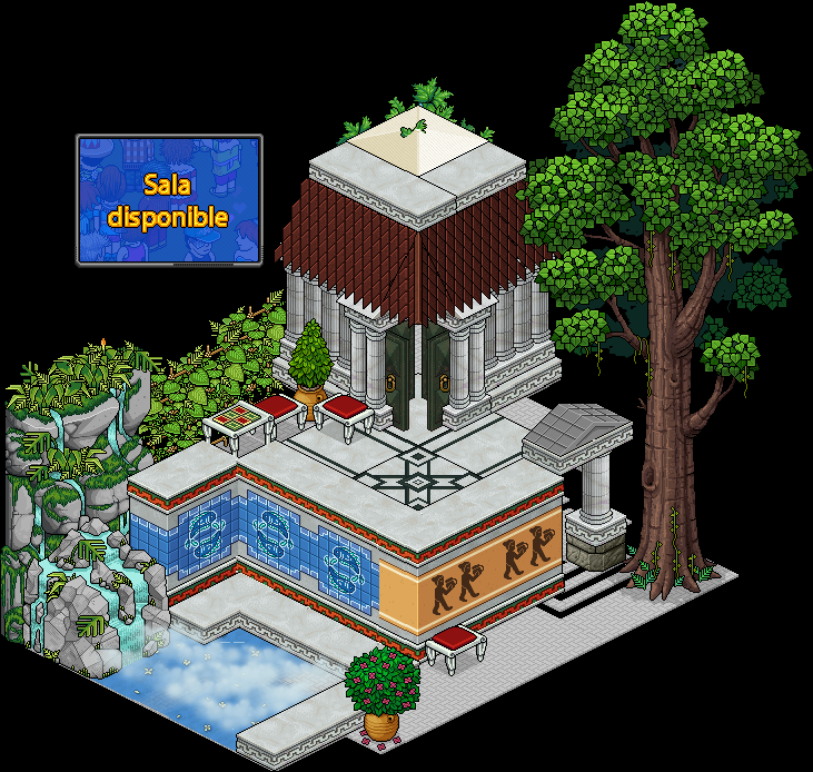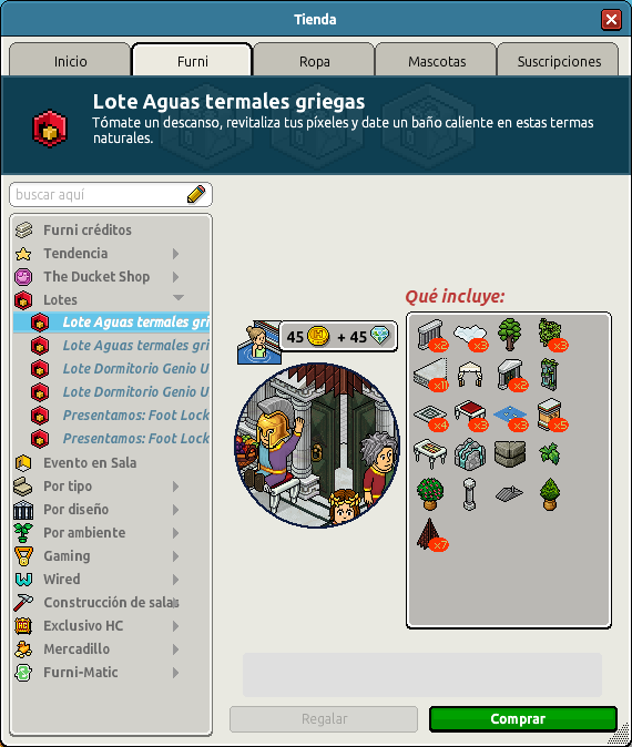 El Lote Aguas termales griegas ya se encuentra disponible en el catálogo de Habbo por un precio de 45 créditos + 45 diamantes o 99 créditos. Estará disponible por un tiempo limitado de aproximadamente una semana. Por su compra, recibirás una placa exclusiva que te mostramos a continuación junto con su contenido y sala.