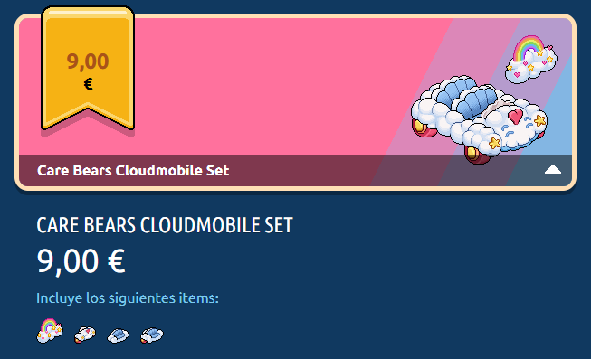El Set Cochenube Osos Amorosos incluye una Nube Osos Amorosos, las tres partes del Cochenube Osos Amorosos y una placa exclusiva. Su precio es de 9,00 € (España y Uruguay) / US$ 10.49 (Argentina, Ecuador, Panamá, Perú y USA) / Ch $ 10.165 (Chile) / CO$ 41.327,58 (Colombia) / MX$ 196.07 (México).