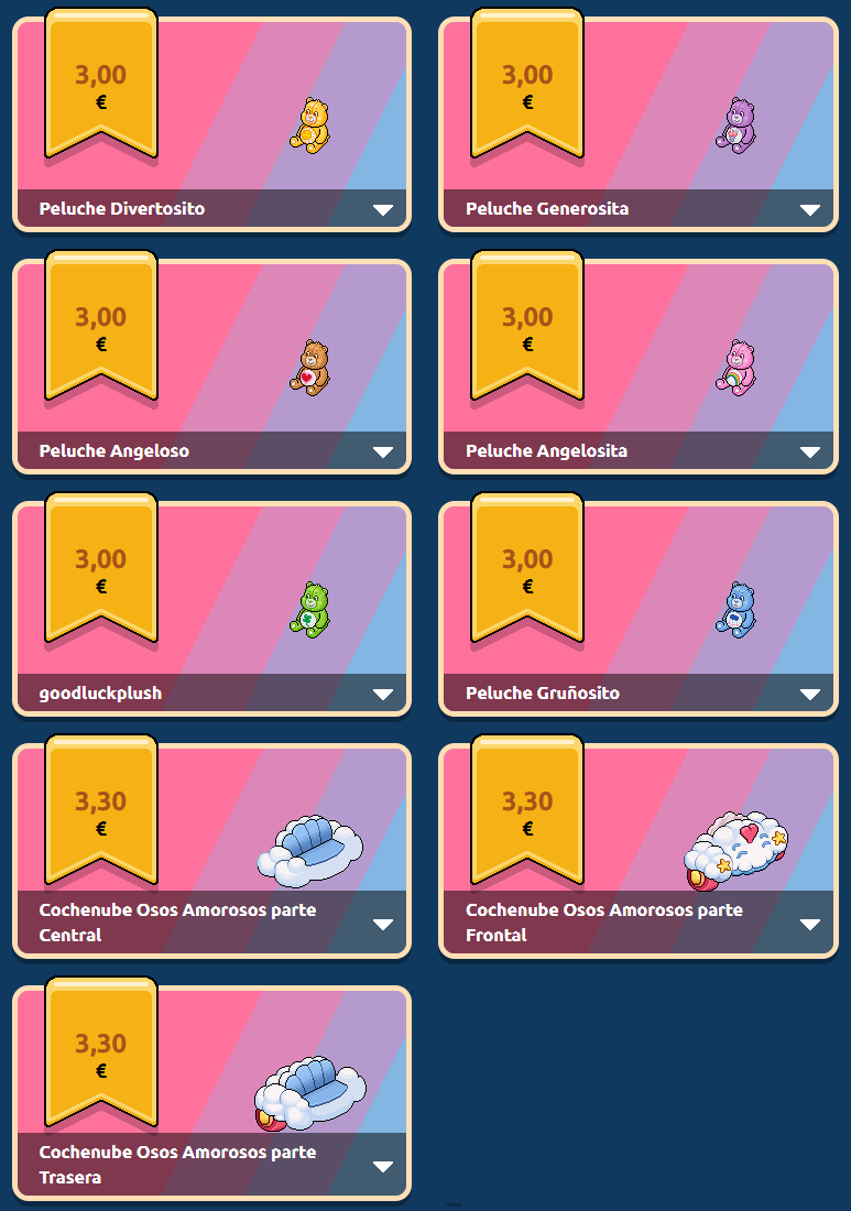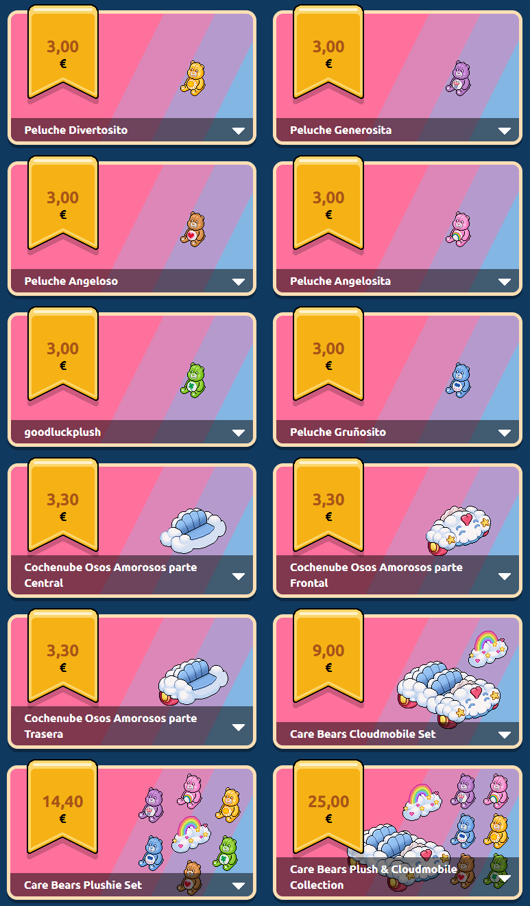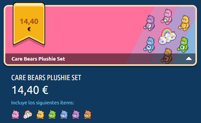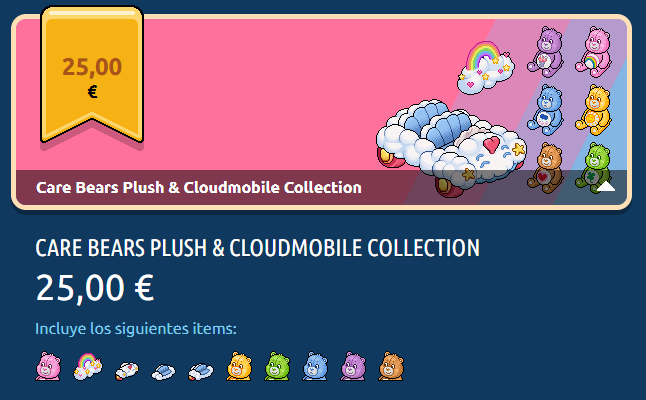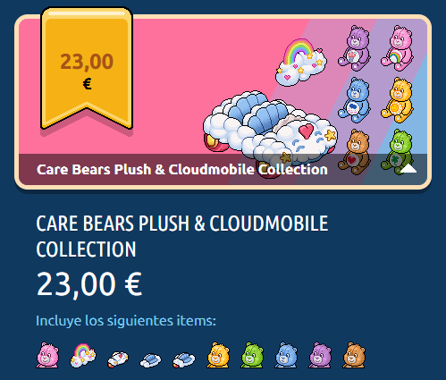 La Colección Peluches & Cochenube Osos Amorosos incluye los 10 furnis Osos Amorosos y una placa exclusiva. Su precio original era de 25,00 € (España y Uruguay) / US$ 29.16 (Argentina, Ecuador, Panamá, Perú y USA) / Ch $ 28.237 (Chile) / CO$ 114.789,85 (Colombia) / MX$ 544.63 (México). Debido al feedback de los usuarios, a las 24 horas el precio fue modificado: 23,00 € (España y Uruguay) / US$ 27.01 (Argentina, Ecuador, Panamá, Perú y USA) / Ch $ 25.715 (Chile) / CO$ 105.311,75 (Colombia) / MX$ 498.77 (México).