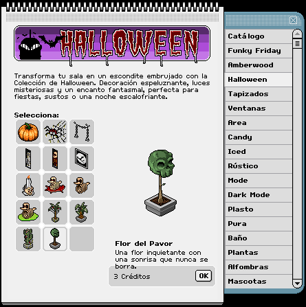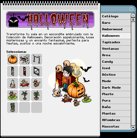 El día de hoy, llegan dos categorías en el catálogo que contienen las línea de furnis Habboween y Amberwood, con motivo al evento de octubre. Para adquirirlos, tendrás que ingresar al catálogo de Habbo Hotel: Orígenes donde podrás encontrar las categorías "Halloween" y "Amberwood". Sus precios varían entre 1 crédito a 10 créditos. A continuación te dejamos los detalles.