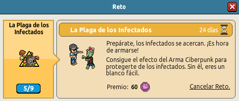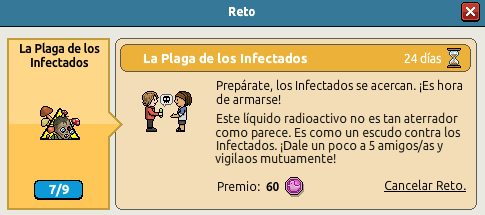 8. La Plaga de los Infectados Prepárate, los Infectados se acercan. ¡Es hora de armarse!Este líquido radioactivo no es tan aterrador como parece. Es como un escudo contra los Infectados. ¡Dale un poco a 5 amigos/as y vigilaos mutuamente! Usa el furni "Lavabo baboso" para obtener el "Líquido radioactivo" y pásalo 5 veces a otros usuarios.