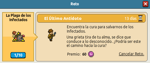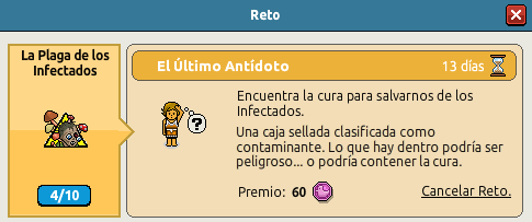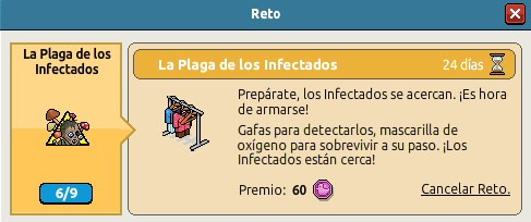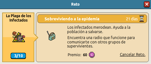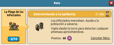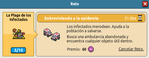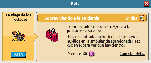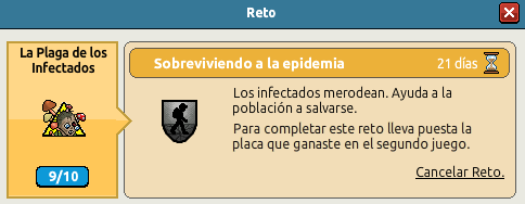10. Sobreviviendo a la epidemia Los infectados merodean. Ayuda a la población a salvarse.Para completar este reto lleva puesta la placa que ganaste en el segundo juego. Ponte en tu perfil la placa "Sobreviviendo en el Hotel de los Infectados" ganada en el Juego 2: Sobreviviendo en el Hotel para completar el reto.