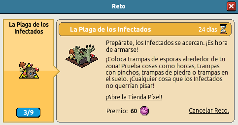 4. La Plaga de los Infectados Prepárate, los Infectados se acercan. ¡Es hora de armarse!¡Coloca trampas de esporas alrededor de tu zona! Prueba cosas como horcas, trampas con pinchos, trampas de piedra o trampas en el suelo. ¡Cualquier cosa que los Infectados no querrían pisar! Deberás tener en tu inventario el furni "Trampa maldita" y colocarla en una sala 5 veces.