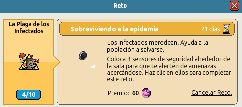 5. Sobreviviendo a la epidemia Los infectados merodean. Ayuda a la población a salvarse.Coloca 3 sensores de seguridad alrededor de la sala para que te alerten de amenazas acercándose. Haz clic en ellos para completar este reto. Haz clic 3 veces en el furni "Sensor".
