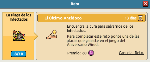 9. El Último Antídoto Encuentra la cura para salvarnos de los Infectados.Para completar este reto ponte una de las placas que ganaste en el juego del Aniversario Wired. Ponte en tu perfil la placa "Píxel de la Cura" ganada en el Juego 3: Caza de Píxeles para completar el reto.