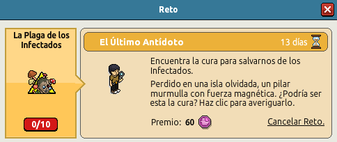 1. El Último Antídoto Encuentra la cura para salvarnos de los Infectados.Perdido en una isla olvidada, un pilar murmulla con fuerza magnética. ¿Podría ser esta la cura? Haz clic para averiguarlo. Haz clic en el furni "Columna magnética".