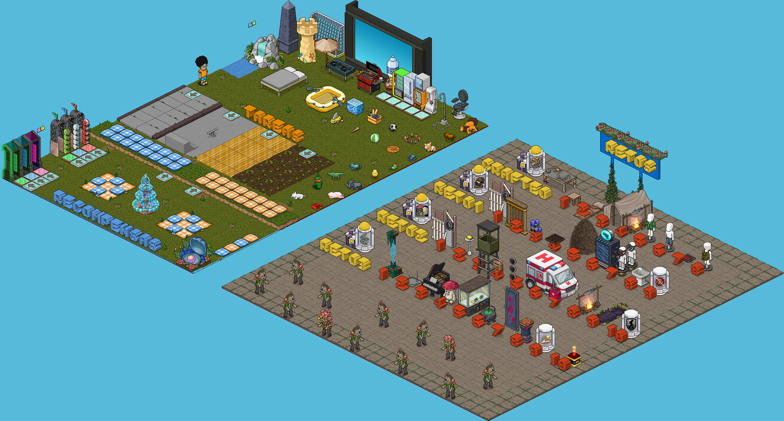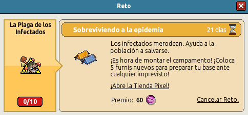 1. Sobreviviendo a la epidemia Los infectados merodean. Ayuda a la población a salvarse.¡Es hora de montar el campamento! ¡Coloca 5 furnis nuevos para preparar tu base ante cualquier imprevisto! Deberás tener en tu inventario el furni "Pared de Barricada" u otro furni de la categoría El último de los Píxeles y colocarlo en una sala 5 veces.