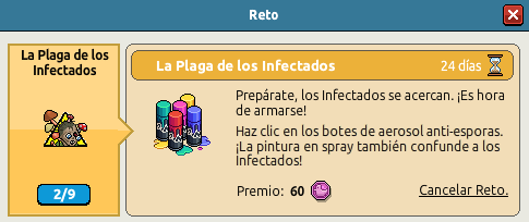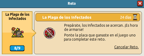 9. La Plaga de los Infectados Prepárate, los Infectados se acercan. ¡Es hora de armarse!Ponte la placa que ganaste en el juego uno para completar este reto. Ponte en tu perfil la placa "Superviviente del Caos" ganada en el Juego 1: Hotel de los Infectados para completar el reto.