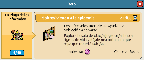2. Sobreviviendo a la epidemia Los infectados merodean. Ayuda a la población a salvarse.Explora la sala de otro/a jugador/a, busca signos de vida y déjale una nota para que sepa que no está solo/a. Pon 3 notas en la sala de otro usuario.