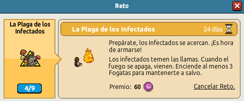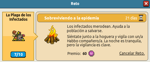 8. Sobreviviendo a la epidemia Los infectados merodean. Ayuda a la población a salvarse.Siéntate junto a la hoguera y vigila con un/a Habbo compañero/a. La noche es tranquila, pero la vigilancia es clave. Sitúate junto al furni "Fuego" por unos minutos.