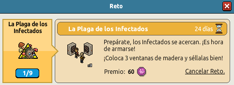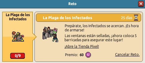 1. La Plaga de los Infectados Prepárate, los Infectados se acercan. ¡Es hora de armarse!Las ventanas están selladas, ¡ahora coloca 5 barricadas para asegurar este lugar! Deberás tener en tu inventario el furni "Pared de Barricada" y colocarla en una sala 5 veces.