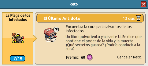 8. El Último Antídoto Encuentra la cura para salvarnos de los Infectados.Un libro polvoriento yace ante ti. Se dice que contiene el poder de la vida y la muerte... ¿Qué secretos guarda? ¿Podría conducir a la cura? Haz clic en el furni "Libro de la Muerte".