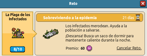 9. Sobreviviendo a la epidemia Los infectados merodean. Ayuda a la población a salvarse.¡Descansa! Busca un saco de dormir para mantenerte caliente durante la noche. Acuéstate en el furni "Saco de dormir Oro Rosa" por unos minutos (sirve cualquier color).