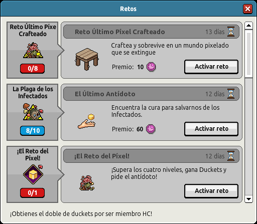 Para acceder a los Retos, deberás hacer clic en el icono de Progreso que se encuentra en la barra inferior del hotel en la versión escritorio del cliente clásico y desde el cliente moderno, y activar el reto de tu preferencia. Por cada reto completado, recibirás algún premio ya sea Duckets, monedas de temporada, una placa o un furni. ¡A continuación te dejamos los detalles de cada reto!