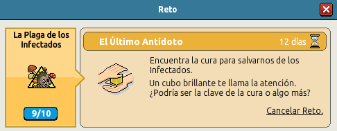 10. El Último Antídoto Encuentra la cura para salvarnos de los Infectados.Un cubo brillante te llama la atención. ¿Podría ser la clave de la cura o algo más? Haz clic en el furni "Cubo Isométrico de Oro".