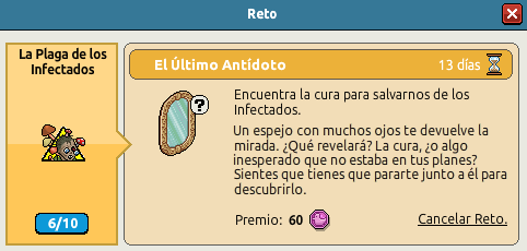 7. El Último Antídoto Encuentra la cura para salvarnos de los Infectados.Un espejo con muchos ojos te devuelve la mirada. ¿Qué revelará? La cura, ¿o algo inesperado que no estaba en tus planes? Sientes que tienes que pararte junto a él para descubrirlo. Sitúate junto al furni "Espejo de ojos múltiples" por unos minutos.
