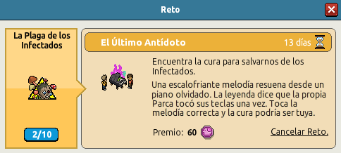 3. El Último Antídoto Encuentra la cura para salvarnos de los Infectados.Una escalofriante melodía resuena desde un piano olvidado. La leyenda dice que la propia Parca tocó sus teclas una vez. Toca la melodía correcta y la cura podría ser tuya. Haz clic en el furni "Piano de Grim Reaper" (sirve purificado o sin purificar).