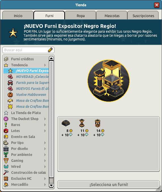 El día de hoy, llega una nueva categoría en el catálogo que contiene la línea de furnis Negro Regio como parte de dicha colección. Para adquirirlos, tendrás que ingresar al apartado Furni » Tendencia donde podrás encontrar la categoría ¡NUEVO Furni Expositor Negro Regio!. Sus precios varían entre 8, 11 y 14 créditos e incluyen diamantes en su costo. A continuación te los enseñaremos.
