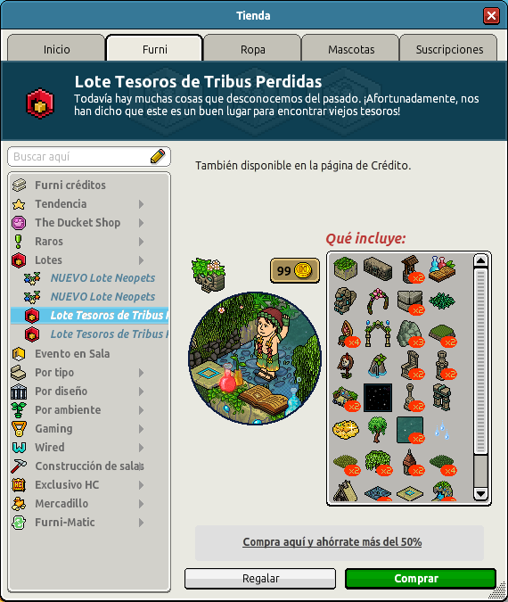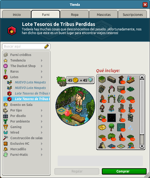 El Lote Tesoros de Tribus Perdidas ya se encuentra disponible en el catálogo de Habbo por un precio de 45 créditos + 45 diamantes o 99 créditos. Estará disponible por un tiempo limitado de aproximadamente una semana. Por su compra, recibirás una placa exclusiva que te mostramos a continuación junto con su contenido y sala.