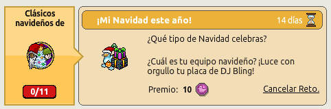 1. ¡Mi Navidad este año! ¿Qué tipo de Navidad celebras?¿Cuál es tu equipo navideño? ¡Luce con orgullo tu placa de DJ Bling! Ponte en tu perfil la placa "Equipo - DJ Bling" obtenida en la Sala oficial: Estación de Navidad para completar el reto.