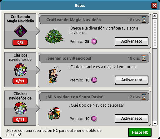 Para acceder a los Retos, deberás hacer clic en el icono de Progreso que se encuentra en la barra inferior del hotel en la versión escritorio del cliente clásico y desde el cliente moderno, y activar el reto de tu preferencia. Por cada reto completado, recibirás algún premio ya sea Duckets, monedas de temporada, una placa o un furni. ¡A continuación te dejamos los detalles de cada reto!
