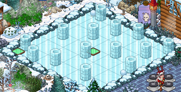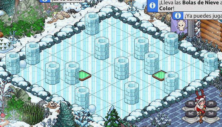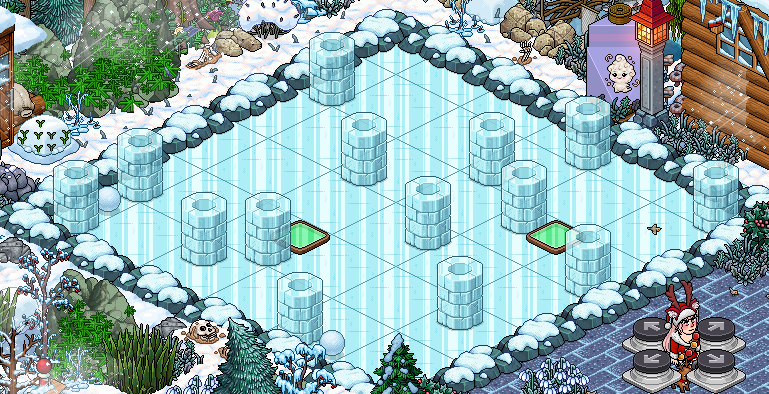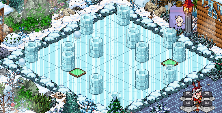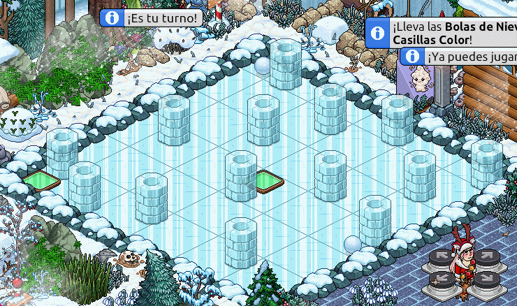 Cuando sea tu turno, tendrás 30 segundos para mover las dos Bolas de Nieve hasta las casillas color. Para moverlas, deberás hacer clic en los furnis "Botón Flecha", según la dirección que desees. Las bolas avanzan por sí mismas y solo se detienen con un obstáculo. Tendrás que detenerlas justo encima de las casillas color, una vez las bolas de nieve estén situadas correctamente, ganarás la placa: Puffi.