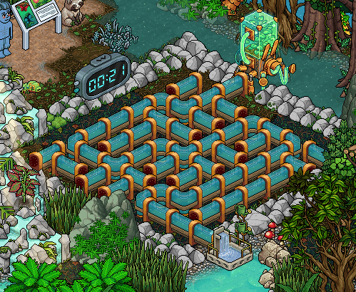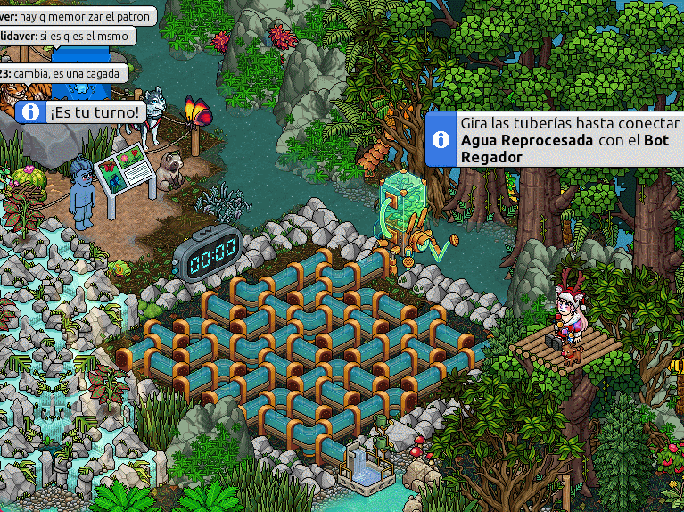 Cuando sea tu turno, tendrás 45 segundos para girar las barras tubo desordenadas haciendo clic en ellas y conectar el Agua Reprocesada con el Robot de riego. Cuando estén conectados, ganarás la placa: GotiGoti.